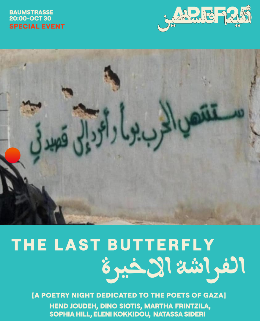 Κάτι περισσότερο από μια ποιητική ανάγνωση, το Last Butterfly είναι μια ποιητική πράξη μαρτυρίας. Μια προσφορά φωνής, ανάσας και παρουσίας που μας προσκαλεί να ακούσουμε βαθιά και να φυλάξουμε χώρο για τη Γάζα μέσα από τη διαχρονική δύναμη της ποίησης, πέρα από τα σύνορα, τις γλώσσες και τη λύπη.